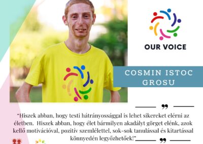 Cosmin Istoc Grosu a kitartás, a motiváció és a tanulás jelentőségéről osztotta meg gondolatait, amellyel a legnagyobb akadályok is leküzdhetők. A testi hátrányokkal született Cosmin saját példáján keresztül szeretné megmutatni társainak, hogy a fizikai nehézségek ellenére is képesek lehetnek sikereket elérni az életben.