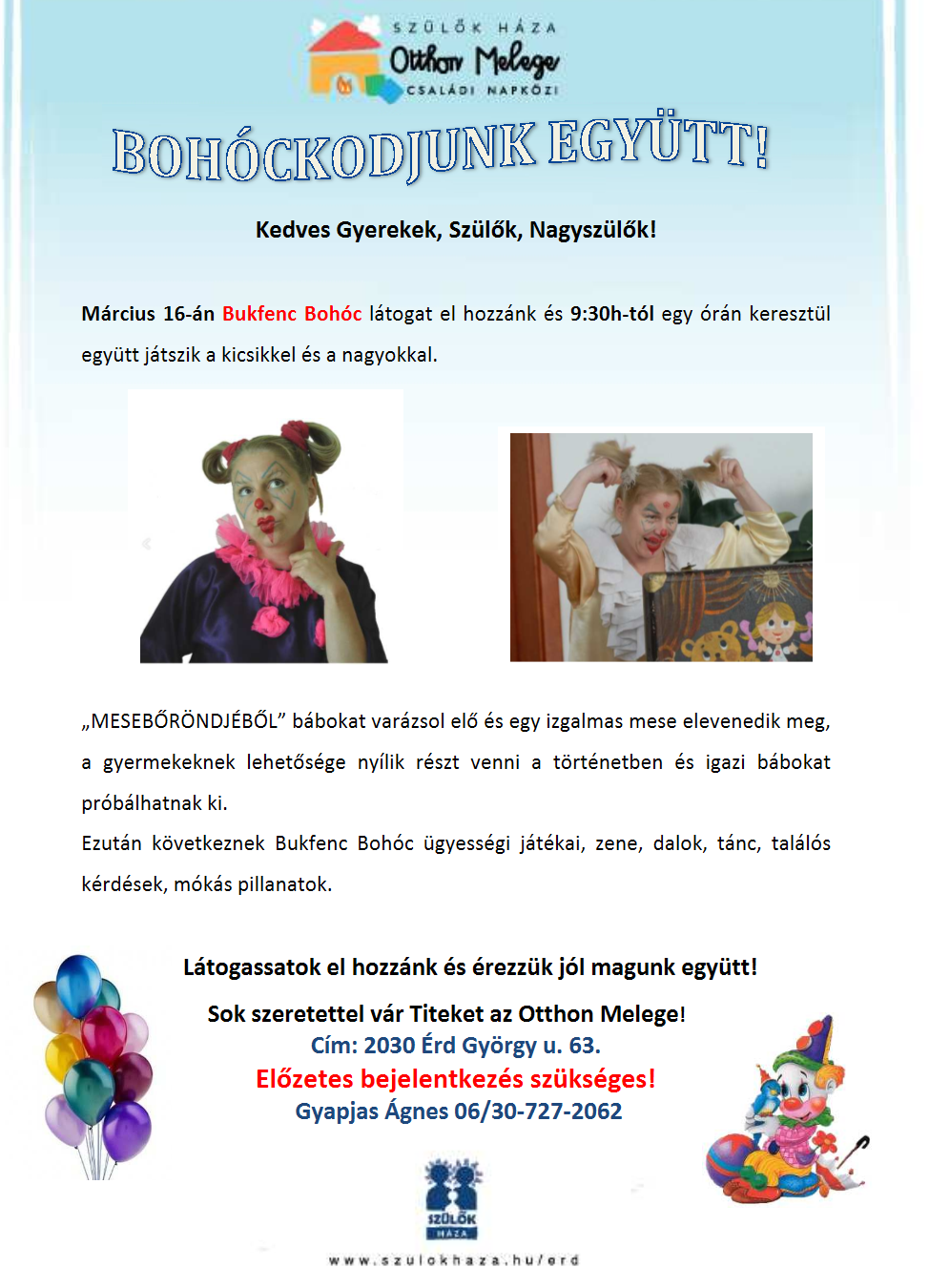 Várunk Szeretettel!!! :) Szerző: Szülők Háza | 2016. márc. 3. | szh | Nincsenek hozzászólások Várunk Szeretettel Bukfenc Bohóccal egy fergeteges „Bohóckodásra”!!!!