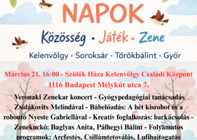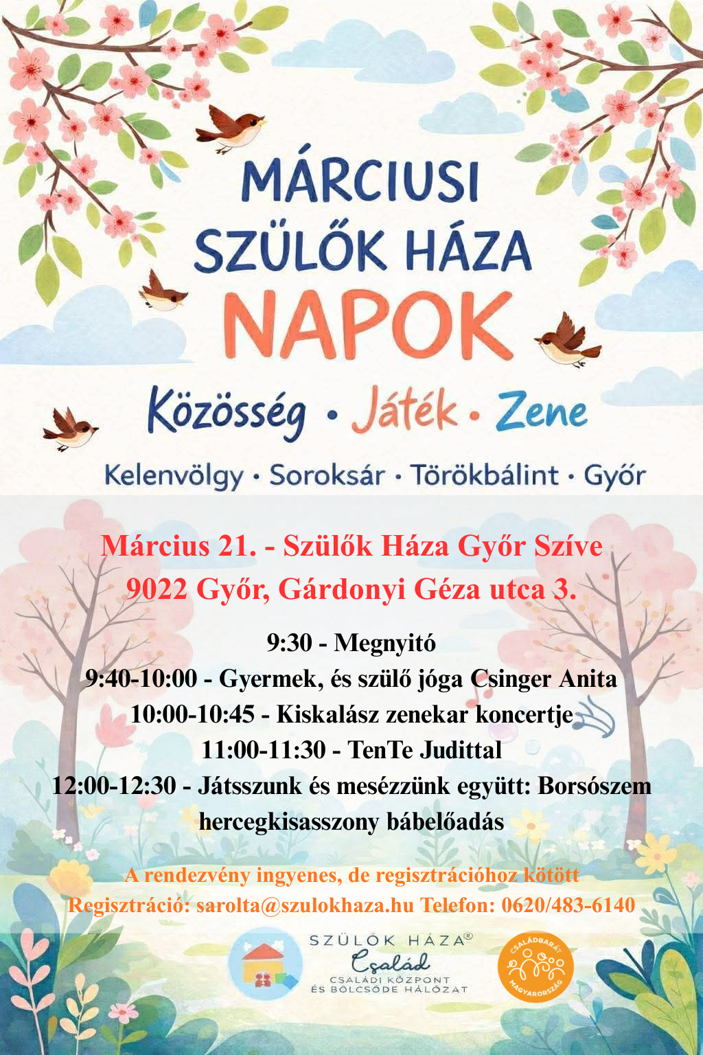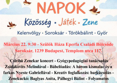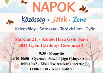 A győri programban a mozgás, a zene és a közös játék kap főszerepet. A résztvevőket többek között gyermek- és szülőjóga Csinger Anita vezetésével, a Kiskalász zenekar koncertje, interaktív foglalkozás TenTe Judittal, valamint a Borsószem hercegkisasszony bábelőadás várja. A „Játsszunk és meséljünk együtt” program különleges közös élményt kínál az egész család számára.