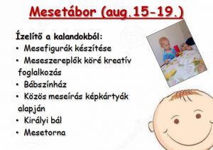 Mesetáborunkban lehetőségünk lesz arra, hogy a fantázia világába kalandozzunk egy nagyot. A mese végtelen tárháza biztosítja nekünk a teret arra, hogy egy mindent elsöprő, fantasztikus hangulatú kreatív tábort tartsunk.