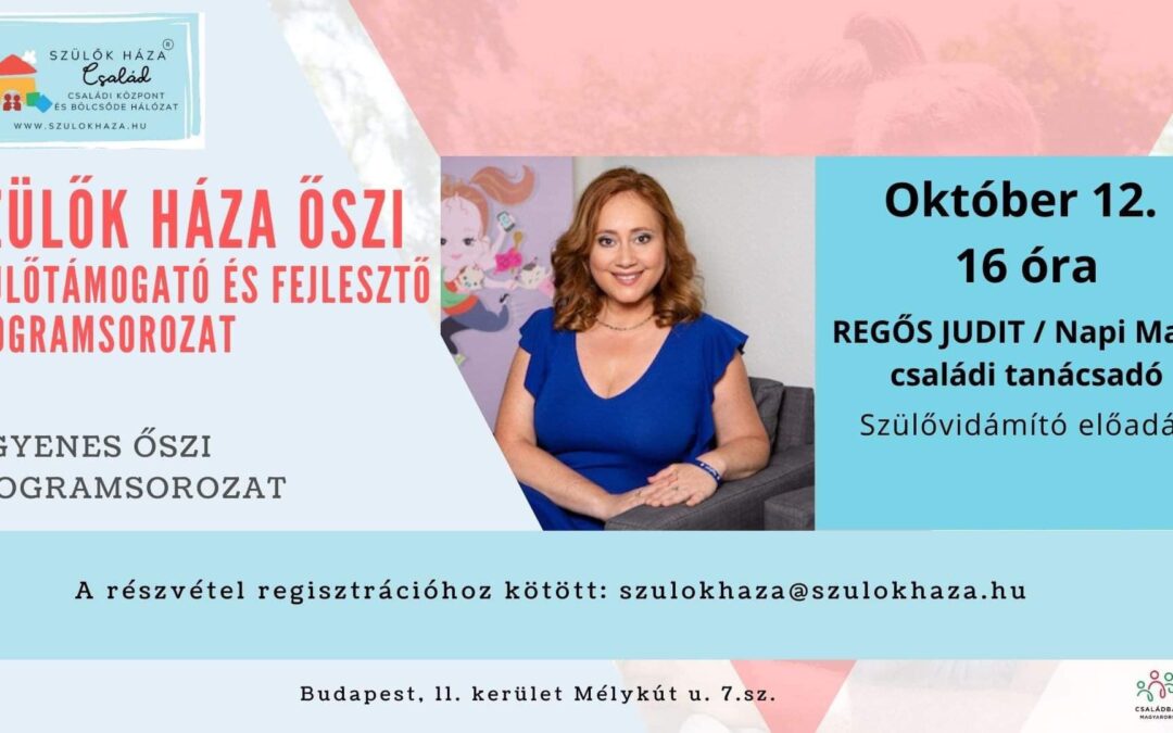 Október 12-én 16 órától Napimami-Regős Judit várja a szülőket a Szülők Háza Kelenvölgyben egy fantasztikus programra!